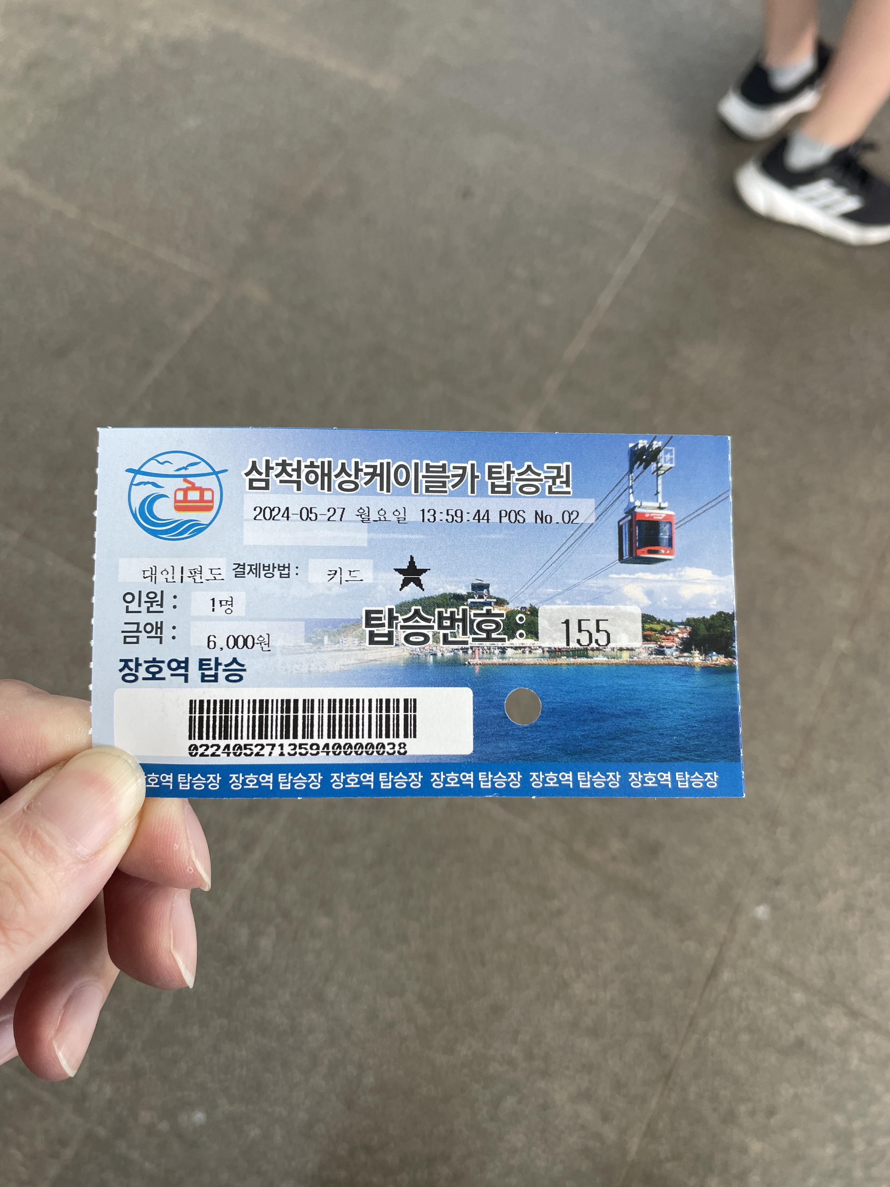 맛있게 먹은 후 오늘의 주요 일정인 초곡 용굴 촛대바위길 트레킹을 위해 움직였다. 우선은 장호항에 있는 삼척해상케이블카를 이용하여 용화해변까지 가기로 했다. 매표소에서 성인 1명 편도행으로 6,000원을 결제했다.
